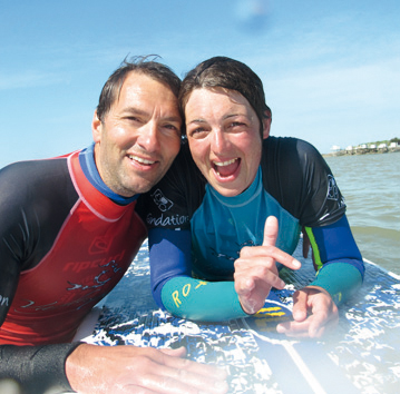 Oui. Je fais de la voile et du surf avec du matériel plus ou moins adapté. Jamais je n’aurai imaginé pouvoir pratiquer de telles activités. Mais c’est tout simplement génial. Sur une planche de body surf, je ressens les vagues, le vent, la glisse. Quand je pars avec la vague, j’ai l’impression de voler, même si je ne sais pas toujours où j’atterris. Mais comme j’ai toutes les autres sensations, un moniteur peut s’occuper de quelqu’un d’autre tout en me guidant à la voix. On n’a pas peur. Je sais aussi que si je dérive, je dois lâcher la planche et retourner vers la plage à la nage. J’ai aussi fait du voilier et même barré ! Comme la plupart d’entre nous avons une maladie évolutive, nous sommes tous fiers et heureux de vivre de tels moments.