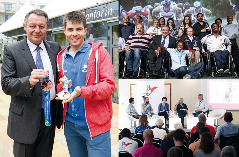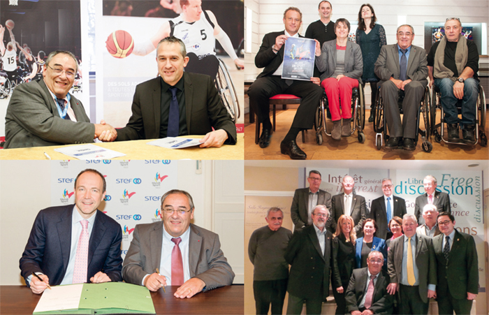 4-5. En 2015, la Fédération a renforcé et étendu son réseau de partenaires en signant de nombreuses conventions, notamment avec Gerflor (1), la Fédération de l’Hospitalisation Privée (2), le transporteur STEF (3), le Lion’s Club International (4), et bien d’autres, qui, par leur soutien contribuent au développement des pratiques handisport en France. © FFH