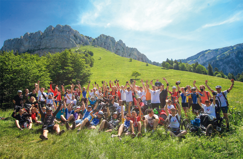 Les comités handisport d’Isère et de Savoie ont organisé les 20 et 21 juin derniers la troisième traversée de la Chartreuse en fauteuil tout terrain, tandem et VTT. Plus de soixante-quinze personnes, dont treize sportifs à mobilité réduite et deux sportifs déficients visuels ont participé, une édition record pour une inoubliable photo de famille ! © G.Picout