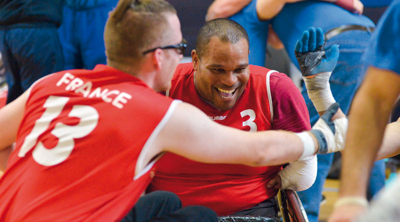 La joie de Cédric Nankin à l’issue de la victoire qualificative pour les Jeux de Rio, face à la Nouvelle-Zélande en demi finale du TQP IWRF (rugby-fauteuil) à Paris le 21 avril.