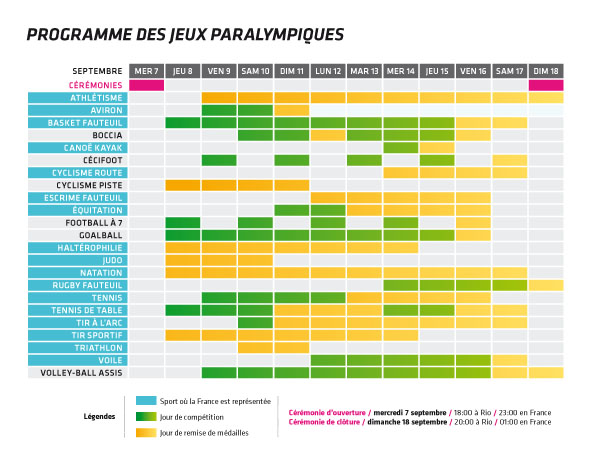 Tous les Brésiliens se sont mobilisés pour cet événement mondial majeur. Pas moins de 30 000 bénévoles se sont portés volontaires pour faire de cette édition une franche réussite. C’est avec fierté qu’ils l’accueillent et voient en cette manifestation, au-delà même du sport, une promesse nationale de progrès. Athlétisme, aviron, basket fauteuil, boccia, cécifoot (foot à 5), canoë, cyclisme sur route, cyclisme sur piste, équitation, escrime fauteuil, football à 7 debout, goalball, haltérophilie, judo, natation, rugby fauteuil, tennis, tennis de table, tir à l’arc, tir sportif, triathlon, voile, volley (assis), telle est la liste des disciplines accueillies à Rio durant le mois de septembre prochain.