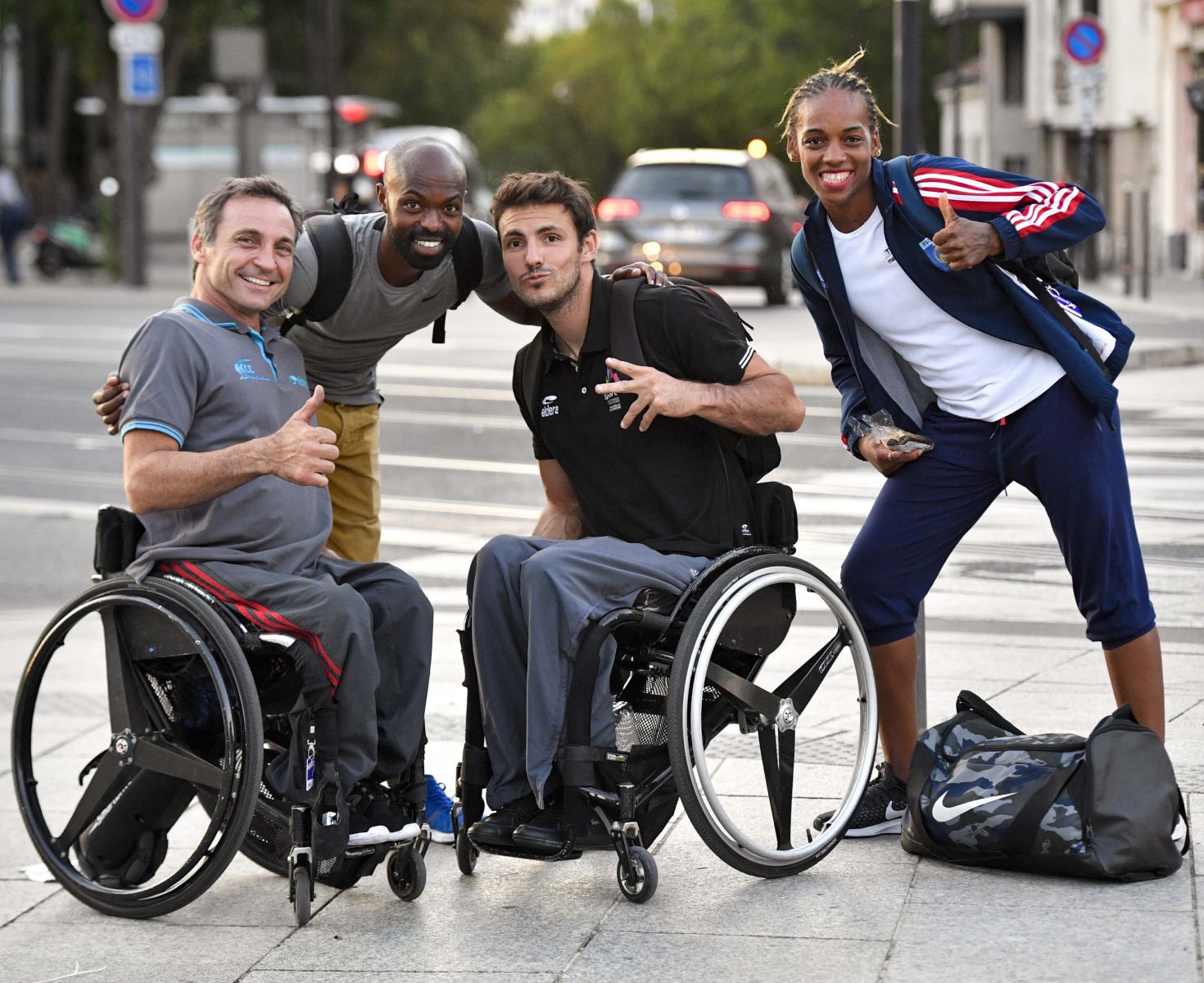 Les athlètes Pierre Fairbank, Clavel Kayitare, Nicolas Brignone et Mandy François-Élie, sur le parvis du Stade Charléty lors du Handisport Open Paris 2019