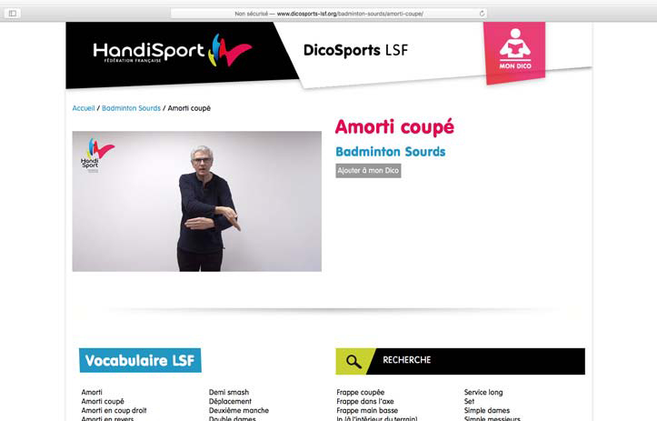 Réalisé en collaboration avec les sportifs sourds de France, le Dicosports LSF (Langue des Signes Française) traduit en vidéos les termes employés par les entraîneurs et les sportifs du mouvement dans 12 disciplines.