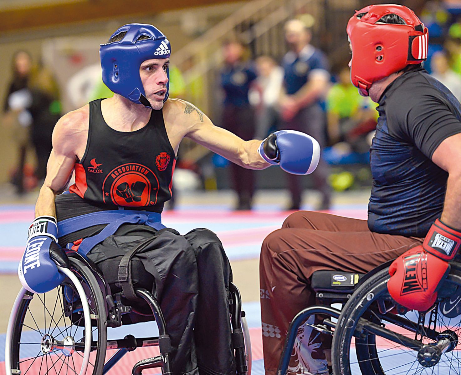 L’équilibre, il en a aussi été question pour Frédéric Guigonis, 41 ans et paraplégique depuis une double décennie. Quand un accident de moto le cloue dans un fauteuil, il commençait à prendre place dans le paysage local de la boxe française valide. À sa sortie de centre de rééducation, il n’est pas convaincu par les différents sports traditionnels. Il reprend alors la boxe dans un club valide, sans réelle structure. « Ce n’était pas simple. » Un passage en handbike et quelques années plus tard, Frédéric Guigonis croise Michel Greco, cofondateur d’un club de boxe ouvert aux personnes en situation de handicap. « Je m’y entraîne depuis six ans », raconte-t-il. « J’ai trouvé le sport où je m’épanouis. Cela me sert aussi pour les transferts dans ma voiture, par exemple. Au-delà de l’aspect ludique, le Lutador Boxing de Nice (club FFH) m’a permis de m’entraîner avec d’autres personnes en fauteuil. » Et comme son passé joue pour lui, il monte même sur le ring contre des valides, ponctuellement installés dans un fauteuil. « Cela me permet de progresser plus vite. »