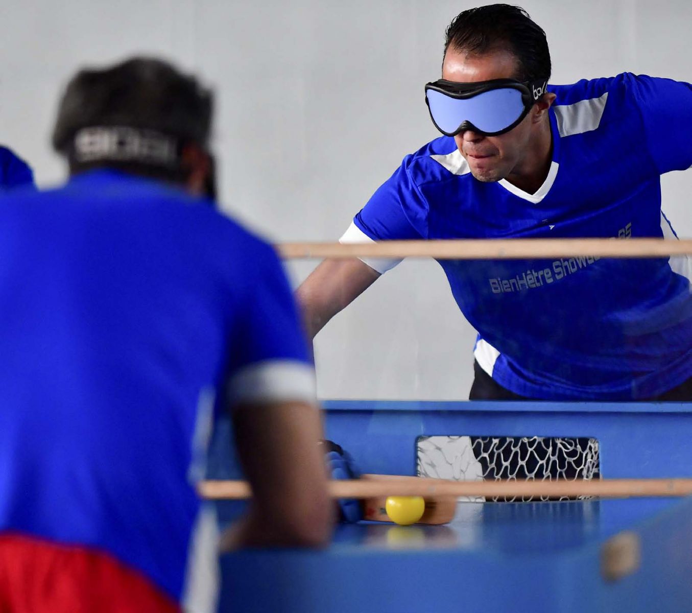 Pratiqué en mixte (homme-femme, senior, valide-déficient visuel), le showdown exige le port d’un masque opaque et nécessite une balle, deux raquettes rigides, une table de showdown et des gants pour se protéger de la balle sonore remplies de billes en aciers. « Peu importe son handicap, son âge, son état physique le showdown permet à tous les joueurs d’avoir les mêmes expériences : auditives, de concentration, de maîtrise de soi et de maîtrise de son mental » confie Madjid. Un mental parfois soumis à rude épreuve. La balle est sonore, rapide et peut vite devenir stressante. « Si l’on ne garde pas son calme, qu’on ne se concentre pas, on peut vite avoir peur de la balle ».