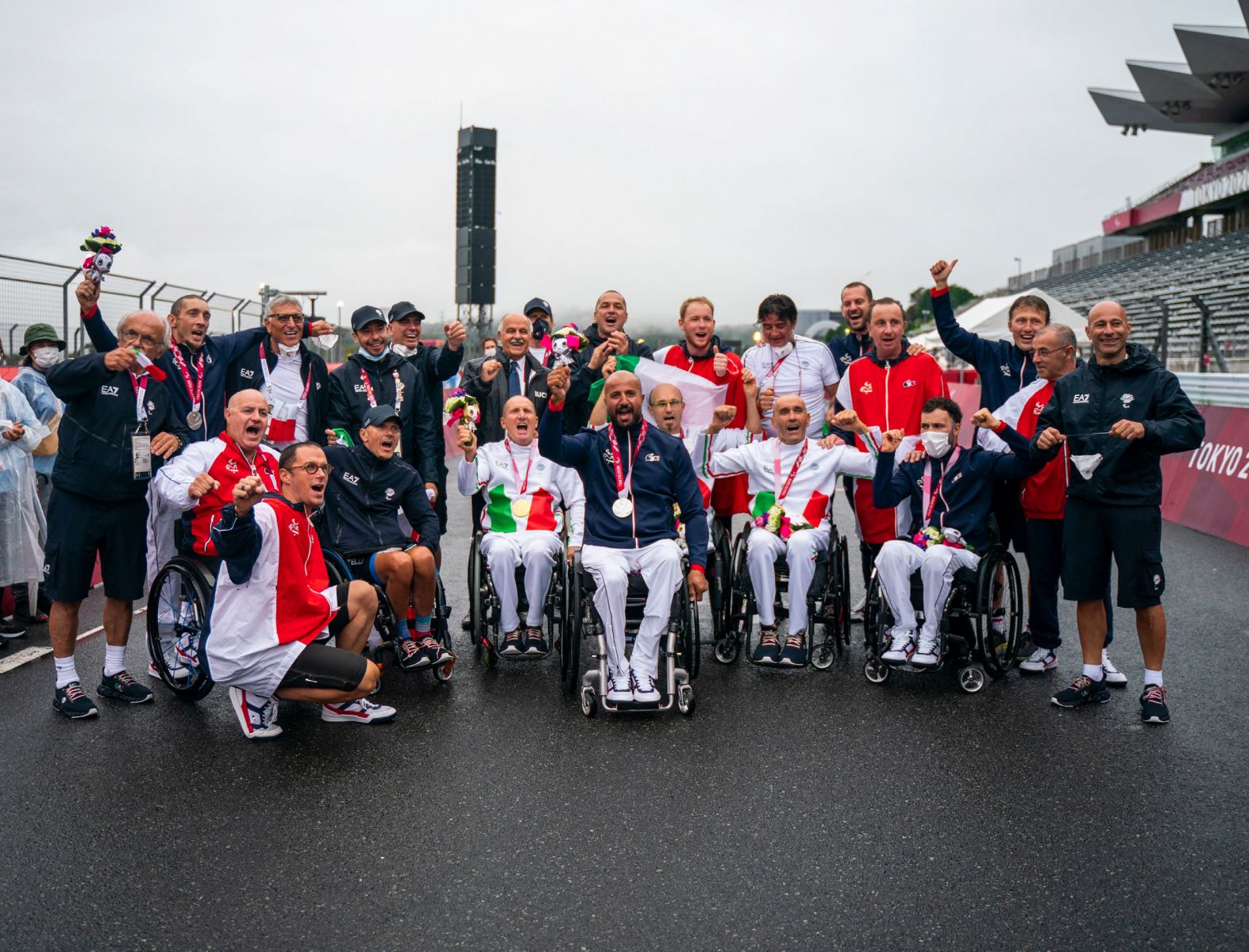 Sous un déluge de pluie et d’admiration, Kévin LE CUNFF (5) monte sur la plus haute marche du podium lors de la course en ligne C4-5 pour entonner la Marseillaise avec tous les Bleus.