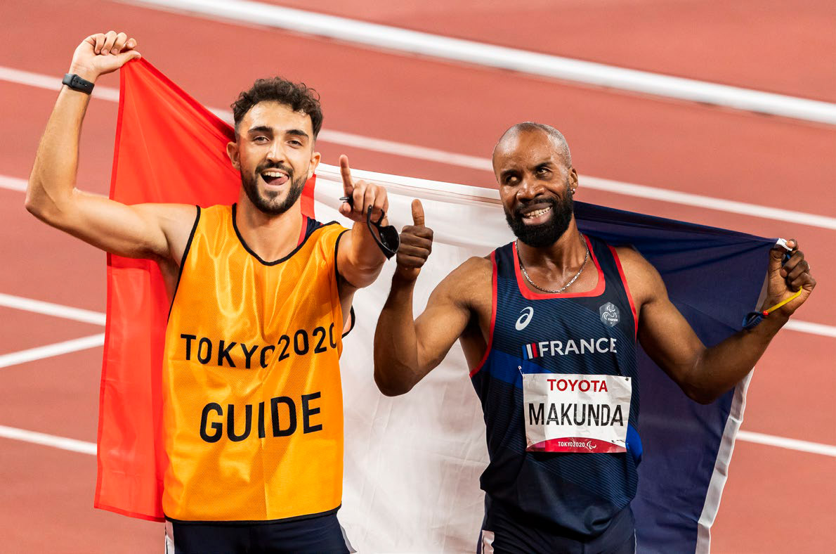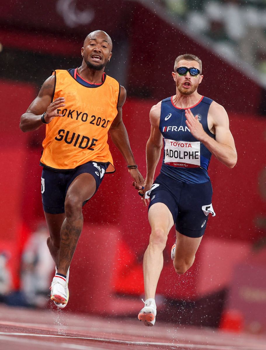 Malheureux sur le tour de piste, disqualifié, Timothée ADOLPHE associé à son guide Bruno NAPRIX (5), se relève, comme toujours, pour aller remporter avec brio la médaille d’argent en finale du 100 m T11. Autre duo brillant, Trésor MAKUNDA & Lucas MATHONAT (6) se classent 3es de la finale du 400 m T11.
