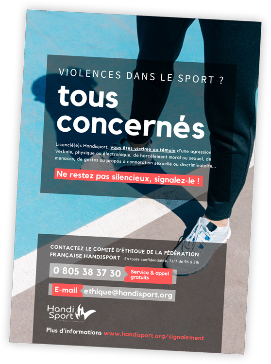 Victime ou témoin d’une agression verbale, physique ou électronique, de harcèlement moral ou sexuel, de menaces… Vous pouvez compléter le formulaire en ligne de signalement : www.handisport.org/signalement/ ou par téléphone au 0805 38 37 30 (n° gratuit, tous les jours de 8h à 21h) ou e-mail ethique@handisport.org
